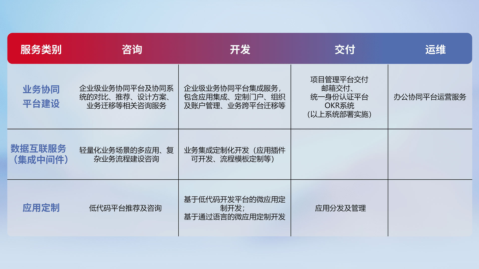 针对钉钉、、、企微、、、IDaas等平台级产品提供产品的规划、、、方案、、、、交付、、、、定制化开发等服务,,,实现如统一协同办公、、、智能客户服务、、、、混合会议管理、、、智能数据查询、、等业务场景,,,,实现数字化转型。。。